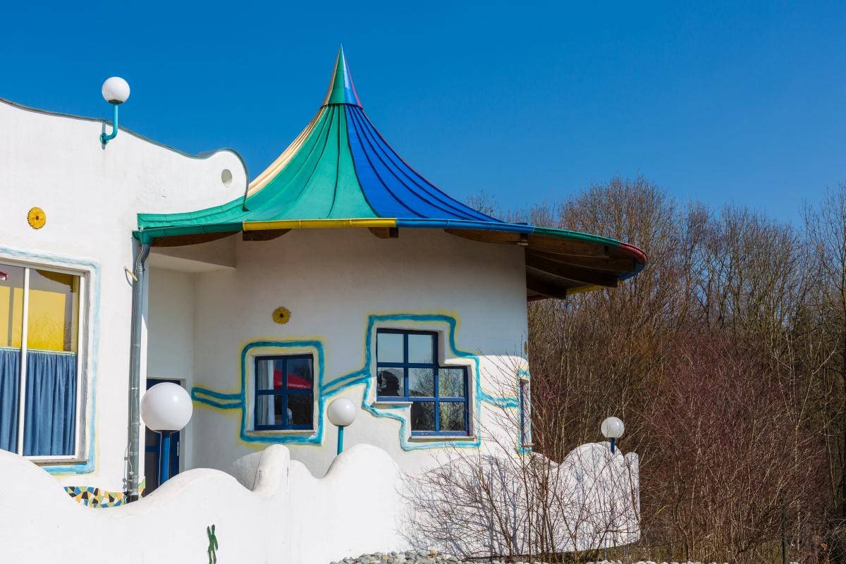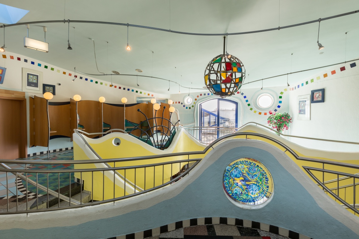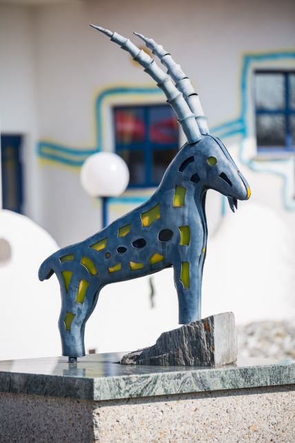 Das zeigt sich an den 12 Tierkreiszeichen vor dem Hause, an dem Abenteuer wie die Errichtung der Türme per Hubschrauber, bis hin zur Materialvielfalt aus Stein, Holz und Glas.